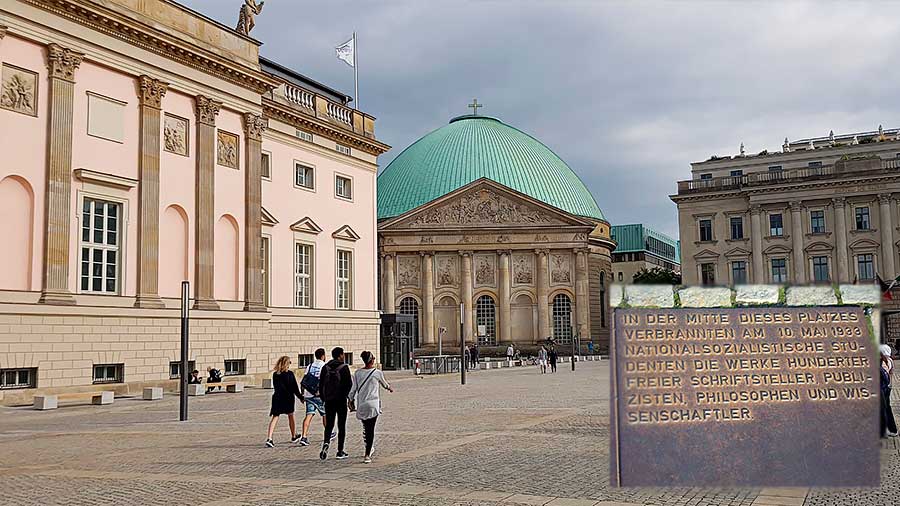 En el centro de Bebelplatz, se puede ver un monumento en memoria a dicha quema. Una losa que cubre una estantería vacía del tamaño del conjunto de libros que se quemaron aquella noche. Desde allí, puedes admirar también edificios preciosos como: la catedral católica de Santa Eduvigis, el edificio de la Ópera de Berlín y la Universidad Humboldt.